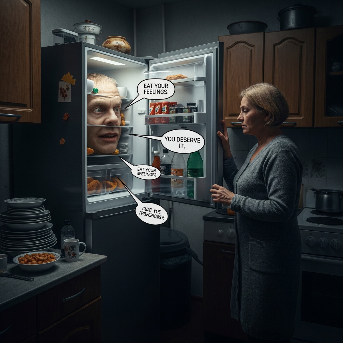 Фу, какая гадость. Гораздо приятнее проглотить пару эклеров, чем осознать, что тебя никогда не любили. Еда — это утешение без вопросов. Она не спрашивает: "Почему ты снова один?" Она просто тает на языке. Пищевая зависимость — это не когда ты голоден. Это когда тебе плохо. Когда мир — помойка, а ты единственный без мусорного бака. В такие моменты хочется хоть чего-то теплого, жирного и понимающего. Именно поэтому твоя рука тянется к третьему бутерброду, а не к терапевту. Ах, славное советское детство. Там, где чувства затыкали манной кашей, а любовь выражалась строго через о