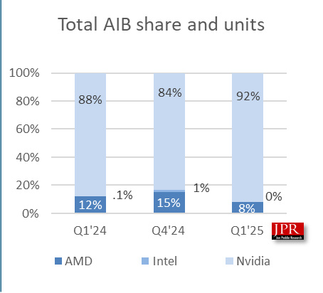 Если кто-то ждёт, что у Хуанга проснётся совесть и он начнёт делать более производительные видеокарты по более низкой цене — не ждите. Потому что у него всё и так хорошо. По итогам 1 квартала 2025 года в мире было продано около 9,2 млн. дискретных видеокарт, из которых 92% пришлось на карточки NVIDIA: AMD, которая с великим трудом добилась годом ранее доли в 12%, а затем довела её до 15% в 4 квартале 2025 года, снова улетела куда-то на дно со своими 8%. У Intel дела ещё хуже, раньше Arc хотя бы учитывалась в статистике с 1%, теперь даже этого нет, хотя поколение Intel Arc B получилось весьма неплохим с точки зрения цены/качества. При этом лидером видеокарт для PC всё равно остаётся Intel, но исключительно за счёт встроек. В этом же 1 квартале 2025 года было продано почти 18 млн. десктопов и только 9,2 млн. видеокарт. Так что больше половины новеньких компов обошлись без дискретных видеокарт: Похожие результаты были и в предыдущих кварталах и даже если Intel не затащит и уступит первое