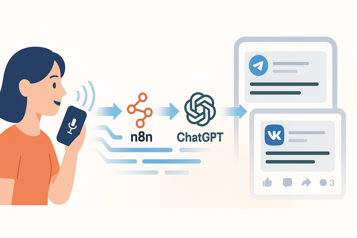 - Через n8n подключили Whisper → ChatGPT → постинг в TG и VK