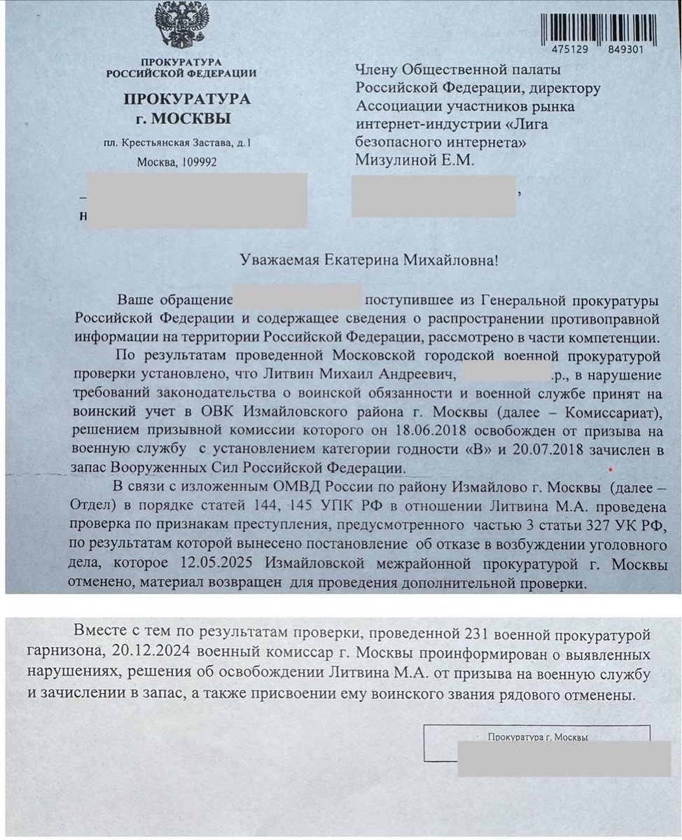 Прокуратура Москвы отменила решение об освобождении блогера Михаила Литвина от призыва на военную службу. Об этом сообщила глава «Лиги безопасного интернета» Екатерина Мизулина.