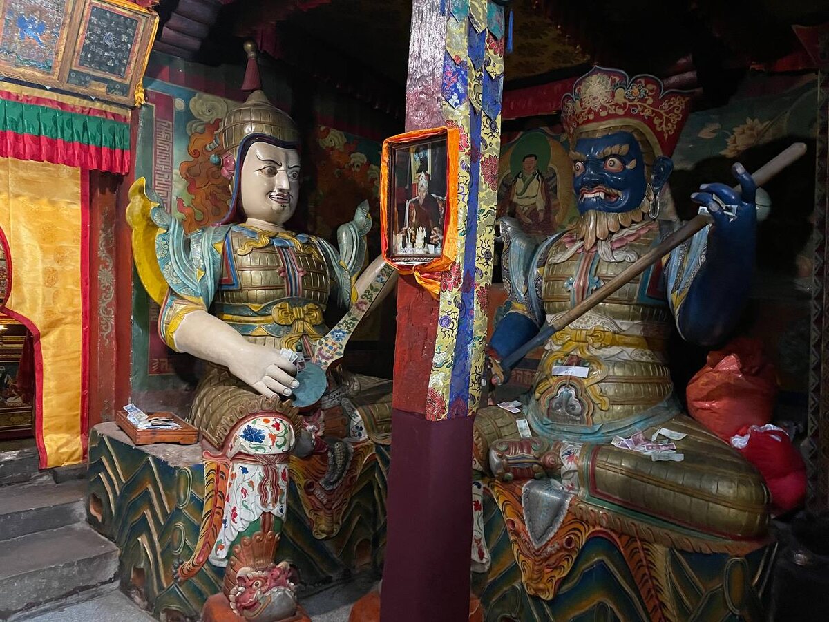 Две большие статуи Будды, немного зловещая комната протекторов со стойким запахом алкоголя, который им подносят. Странная комната с чучелами местных животных – видимо, отголоски религии Бон.