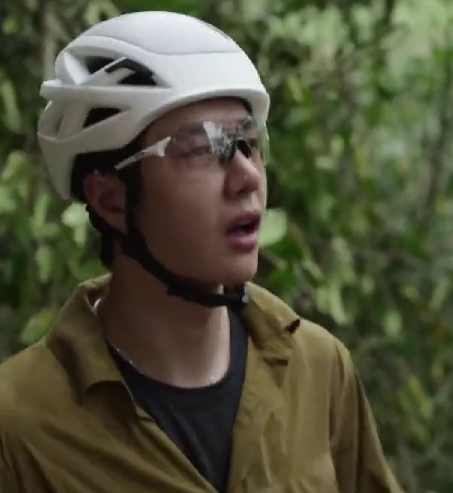 Переночевав в гамаках на высоком склоне, Ван Ибо и инструктор продолжили спуск, прокладывая маршрут и закрепляя опорные крюки. А потом снова полезли вверх - по тому маршруту, который только что проложили. Ван Ибо переживал, что не справится. Первым полез инструктор, Ибо его страховал. Ибо, конечно, устал за эти дни. Осознал, что его руки недостаточно сильные. Но стали уставать и ноги, уж слишком большое напряжение. А опасность заставляет мышцы напрягаться еще сильнее. Инструктор, наконец, добрался до места ночевки, А Ван Ибо пришлось пережидать сильный дождь. Вот он уныло сидит, прижавшись к скале: Потом полез. Трудно было, весь вымок - обратите внимание на штаны: светло-зеленый цвет там, где они сухие, все остальное мокрое. Инструктор его все время подбадривает, дает советы - Ибо сказал, что это ему очень помогало и воодушевляло. Наконец, добрался. И даже инструктор признался, что было нелегко. Ван Ибо совершенно выдохся и сказал, что вряд ли сумеет подняться выше. На что инструктор