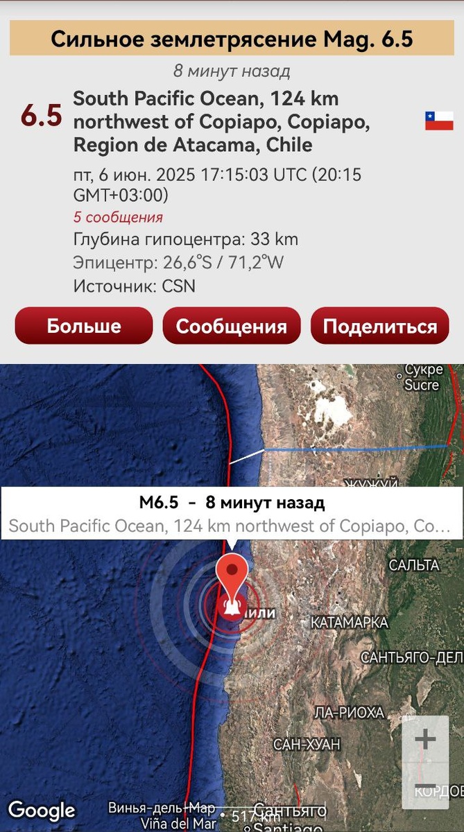 В ответ на пост Согласно вчерашнему прогнозу про приближение сейсмики М6.5+ на глобальном уровне произошло землетрясение М6.5 у побережья Чили. ОСТИ по Чили на данную магнитуду были опубликованы 4 июня. Сегодняшние ОСТИ по Южной Америке сюда же. ==== According to yesterday's forecast about the approach of the M6.5+ earthquake, an M6.5 earthquake occurred off the coast of Chile on a global level. CSTI in Chile for this magnitude was published on June 4. Today's post about South America can also be attributed to this seismic event too.