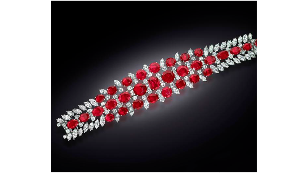 Этот платиновый браслет украшен 31 бирманским рубином старинной огранки (общей массой 60 карат), обладающим глубоким, высоко ценимым цветом, который называют «голубиная кровь». Бирма, в частности регион вокруг Могока, была основным источником рубинов с конца XV века. Рубины из этого региона известны своим насыщенным и ярким цветом, поэтому термин «бирманский рубин» является синонимом лучших цветных рубинов. Красный или слегка пурпурно-красный цвет, средний по насыщенности, с яркой красной флуоресценцией, называется «голубиная кровь». Рубины в этом браслете были взяты из другого ювелирного изделия и пере закреплены компанией Harry Winston, Inc. в 1950 г. Оригинальная огранка была сохранена, и камни были закреплены в 3-рядном платиновом браслете с бриллиантами. Сопутствующие бриллианты грушевидной, маркизной и круглой огранки в общей сложности составляют 27 карат. Этот прекрасный браслет был подарен Смитсоновскому институту в 1961 г. и выставлен в Галерее драгоценных камней Национального музея естественной истории.