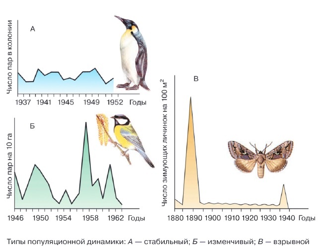 Выделяют три типа популяционной динамики: стабильный, изменчивый и взрывной. Стабильным считается ход численности при изменениях всего в несколько раз, изменчивым — при колебаниях в десятки раз, а взрывная динамика характеризуется периодическим превышением обычной численности в сотни и тысячи раз.