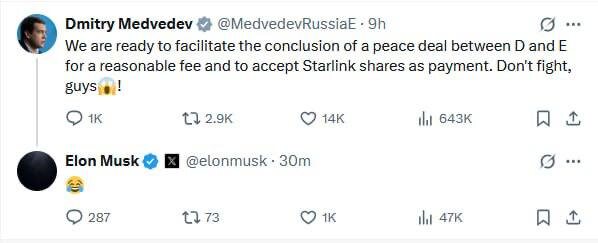 Маск оценил шутку Медведева о готовности помирить его и Трампа за акции Starlink @SPUTNIKBY