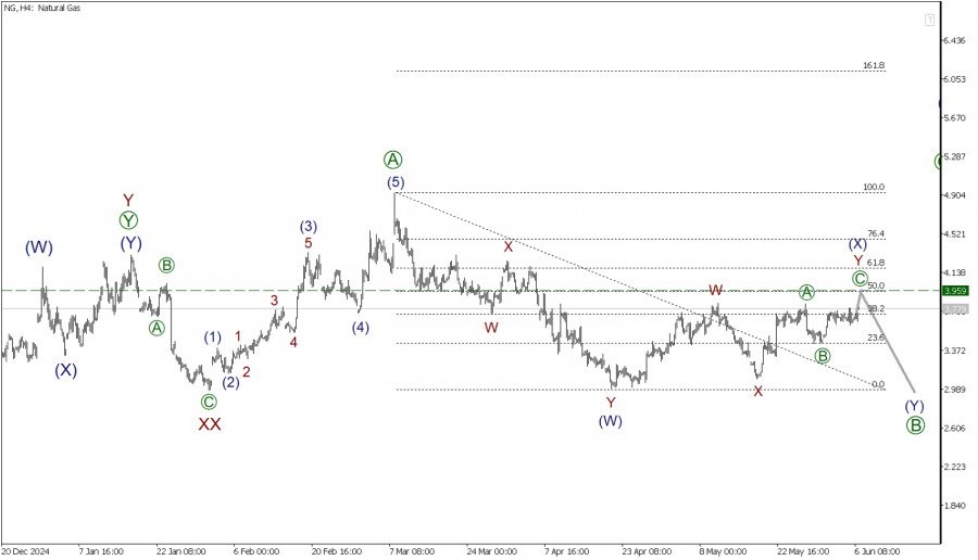 https://basechop.ru/wordpress/?p=45292 По Газу в глобальной перспективе формируется крупный коррекционный тренд. На текущем графике представлена разметка большой действующей волны (Y), принимающей форму тройного зигзага W-X-Y-XX-Z. На текущем графике мы видим, что действующая волна Z похожа на стандартный зигзаг, внутри которого завершен импульс [A]. Сейчас может формироваться коррекционная подволна [B], которая, судя по всему, принимает форму двойного зигзага (W)-(X)-(Y). Предполагается, что первая часть указанного двойного зигзага уже завершена, то есть имеется в виду действующая волна (W). В настоящее время на последнем участке графика может строиться волна связка (X), внутренняя структура которой похожа на двойной зигзаг W-X-Y. Для полной комплектации двойного зигзага W-X-Y необходима заключительная действующая подволна Y. Вполне возможно, что Y примет форму стандартного зигзага [A]-[B]-[C]. Скорее всего, цена поднимется к отметке 3.95, на которой величина волны (X) составит 50% от