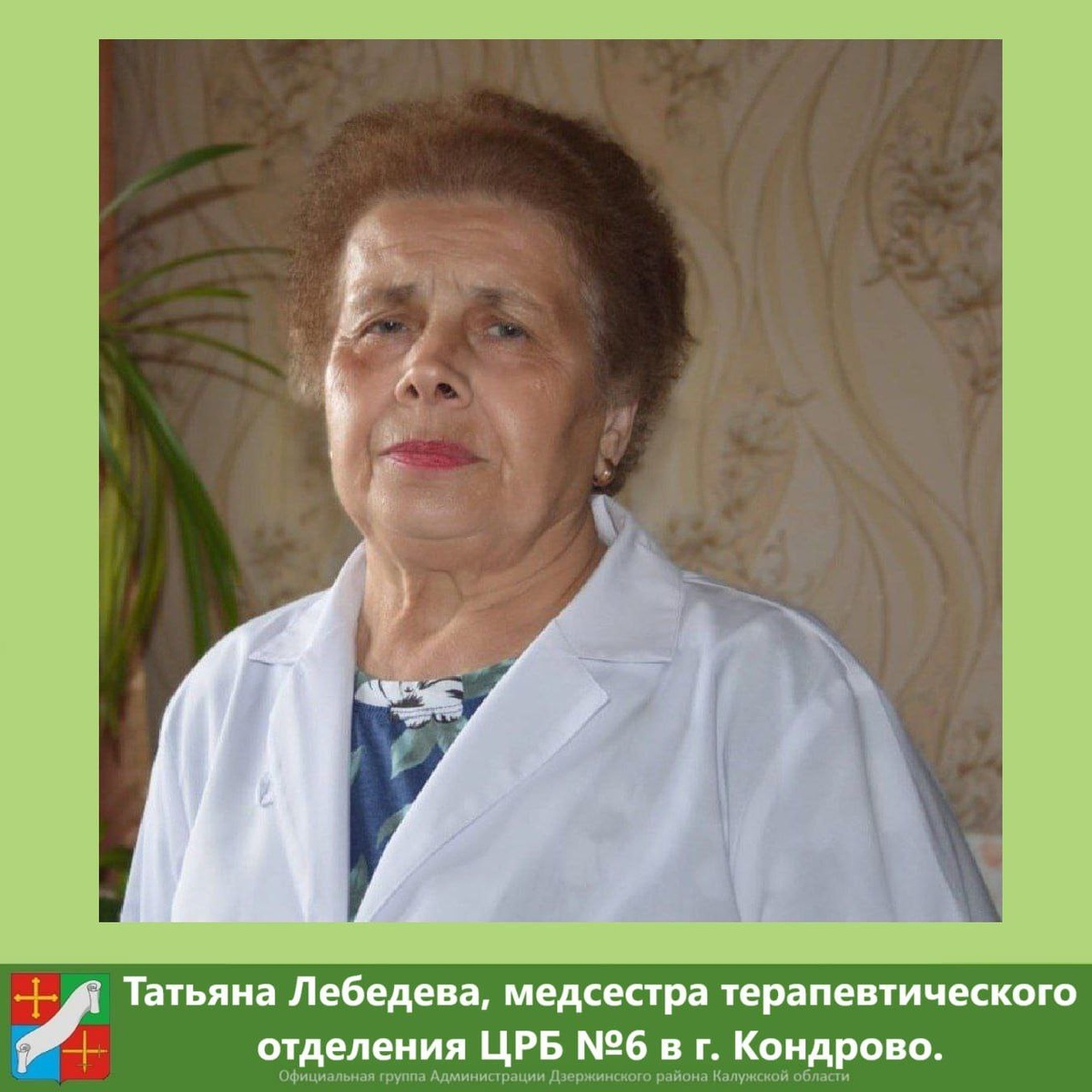 Татьяна Николаевна Лебедева, медицинская сестра терапевтического отделения Центральной межрайонной больницы №6 в г. Кондрово. За 50 лет трудовой деятельности ни разу не пожалела о своем выборе. Татьяну Николаевну можно по праву считать основателем медицинской династии. Старшая дочь Ирина работает медицинской сестрой в терапевтическом отделении больницы. Внучка Виолетта тоже решила связать свою жизнь с медициной. Сейчас она оканчивает третий курс университета. За долгую трудовую деятельность Татьяна Николаевна Лебедева имеет много наград различных уровней, а в 2024 году за многолетний добросовестный труд в системе здравоохранения и высокопрофессиональное исполнение должностных обязанностей награждена Почётной грамотой губернатора Калужской области. #Тема_дня_Наши_лица