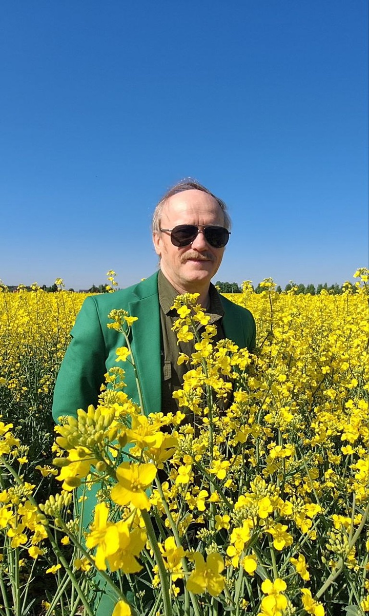 На самом деле я ехал на машине и, остановившись у жёлтого поля сурепки, попросил Нину Сергеевну сфотографировать меня в двух шагах от края поля. Небо надо мной было невероятно глубокой синевы.