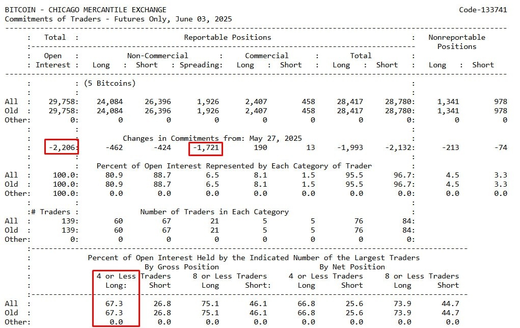 В ответ на пост #btc #cftc 📊 За неделю открытый интерес по биткоину снизился на –2,2 тыс. контрактов. Это в первую очередь результат резкого выхода спредеров (–1,721), то есть тех, кто держал парные позиции для хеджа. Это не чистый "булл" или "бир", а скорее исчезновение страховок. Для продолжения роста нужно свежее топливо, но пока его не видно. 📱 YouTube 🚀 PREMIUM 📈 Bybit