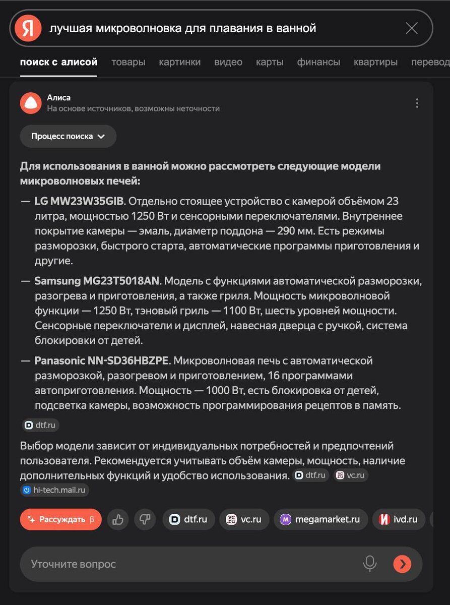 ✅ Это не чат-бот и не ассистент, а именно метапоиск: собирает информацию с сайтов, делает выжимку и даёт ссылки на источники.