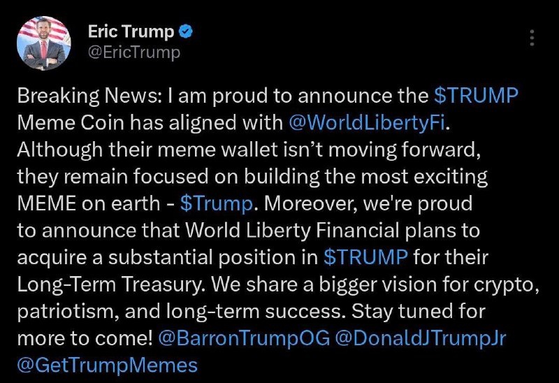 🗣Эрик Трамп объявил, что мем-коин TRUMP объединился с World Liberty Financial