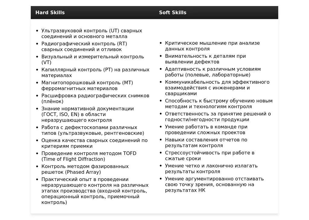 - На какие качества и навыки делать акцент: Знание методов неразрушающего контроля, умение работать с оборудованием, знание нормативной документации, внимательность к деталям, ответственность, обучаемость.