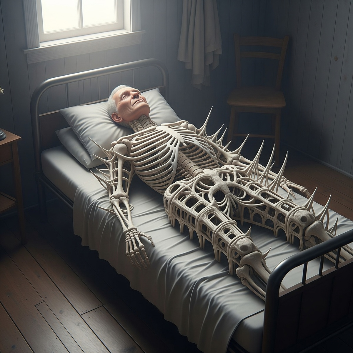 Я ухаживал за отцом последние два года его… преображения. Я видел, как его ребра начали расти наружу, изгибаясь и срастаясь друг с другом, создавая вокруг его груди ажурную, но несокрушимую решетку. Я видел, как позвонки на его шее выпускали отростки, которые медленно, день за днем, сплетались в подобие высокого, готического воротника-горжета. Его собственные кости, его опора, становились его тюрьмой. Он лежал на кровати, почти неподвижный, опутанный этой белой, растущей паутиной, и молча смотрел в потолок.
