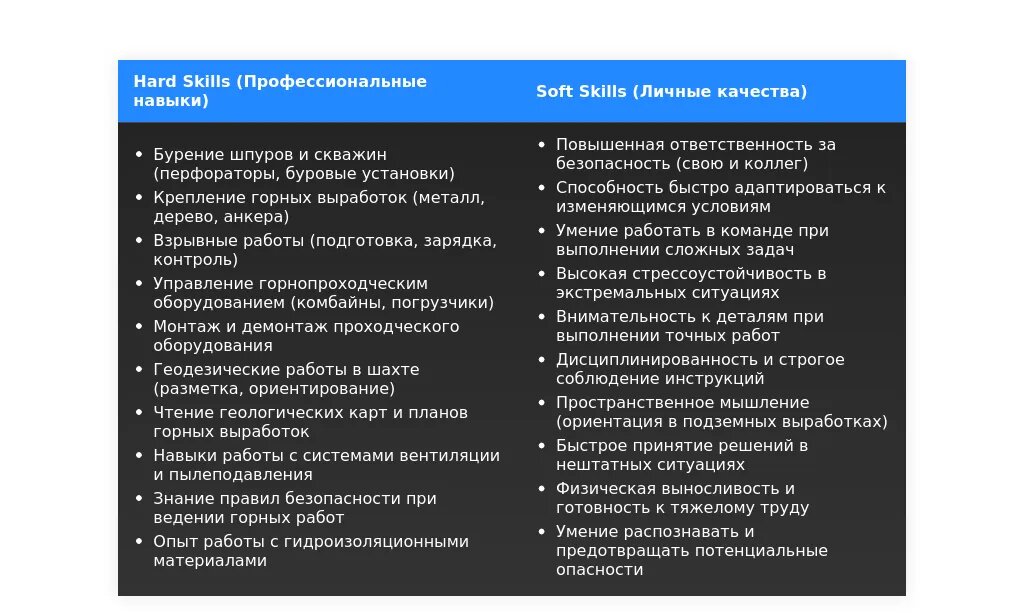 Анализ: Обязательно наличие удостоверения проходчика. В резюме нужно подчеркнуть навыки работы в команде и базовые знания геологии.