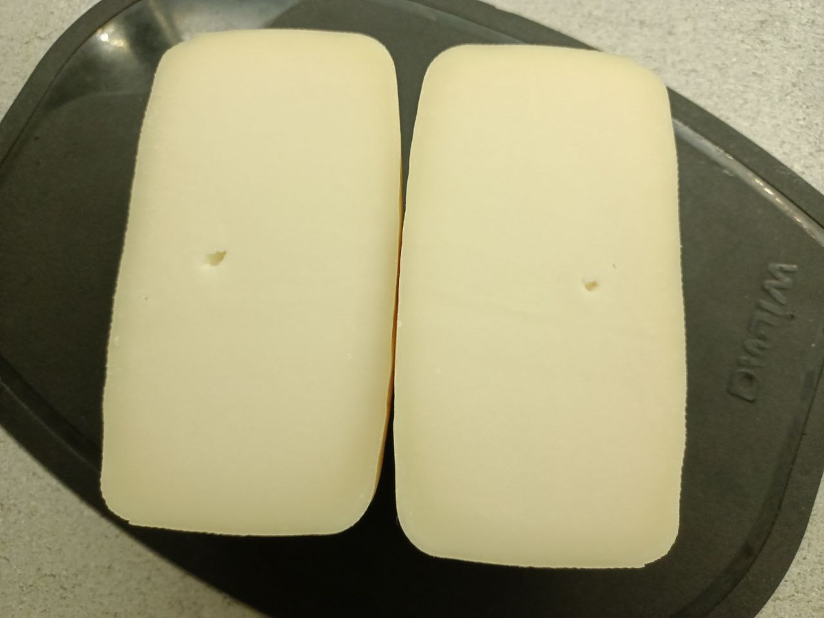 Этот сыр сформован из пласта под сывороткой, что даёт нам слепой срез, то есть без дырочек. Давно хотела освоить его и вот вуаля👆