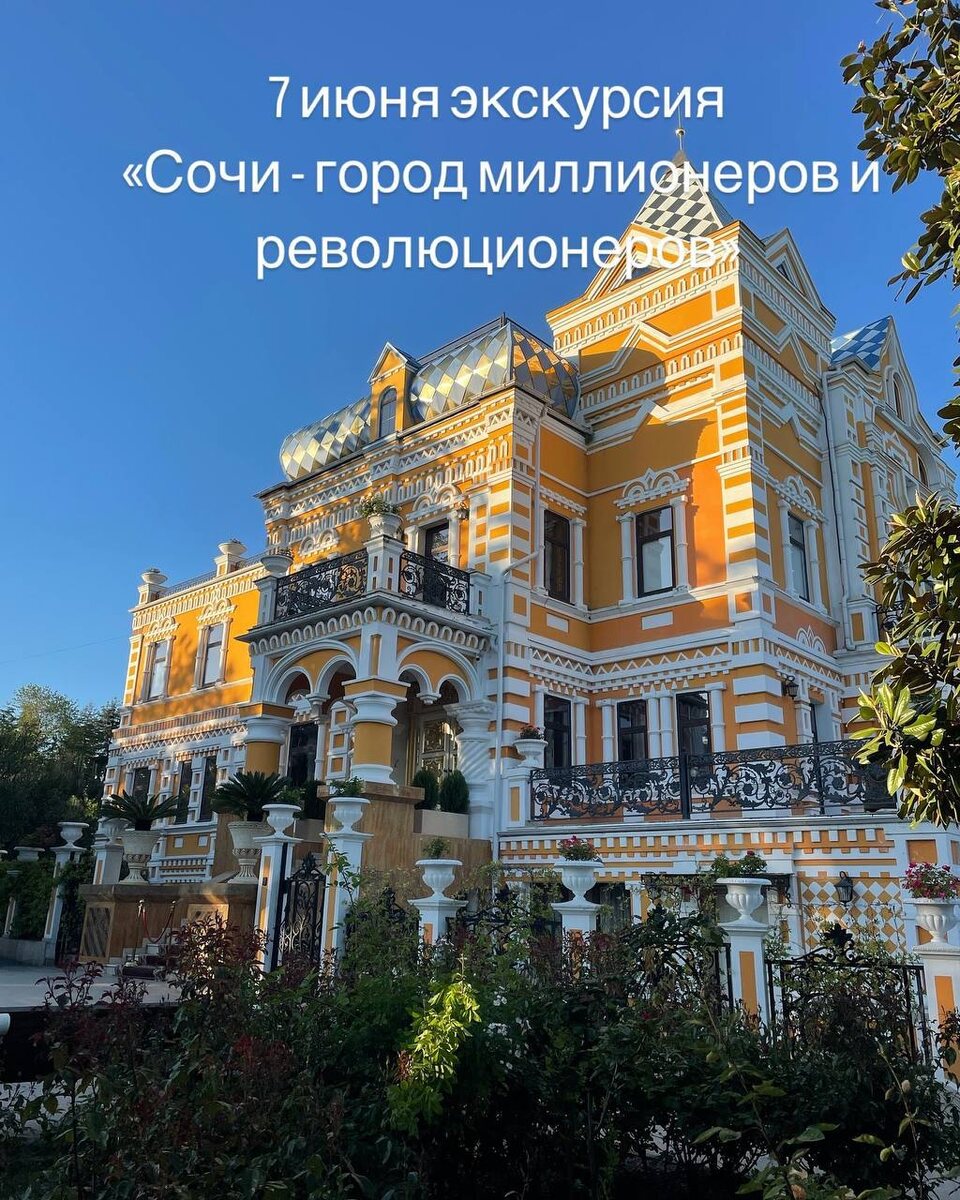 7 июня в 11.00 экскурсию «Сочи - город миллионеров и революционеров». Скандалы, интриги, расследования. Яркие люди, громкие события и резкие повороты. Все как мы любим. Мест видимо-невидимо. Записывайтесь +79882332270 Продолжительность 2 часа Стоимость 1500 руб.