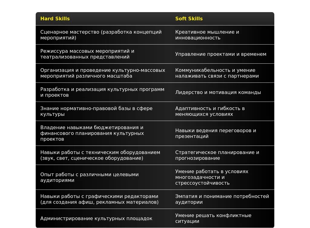- Для вакансий в сфере культуры: "Разработка концепций мероприятий", "Привлечение аудитории", "Создание культурного контента", "Работа с творческими коллективами", "Организация выставок и экспозиций".