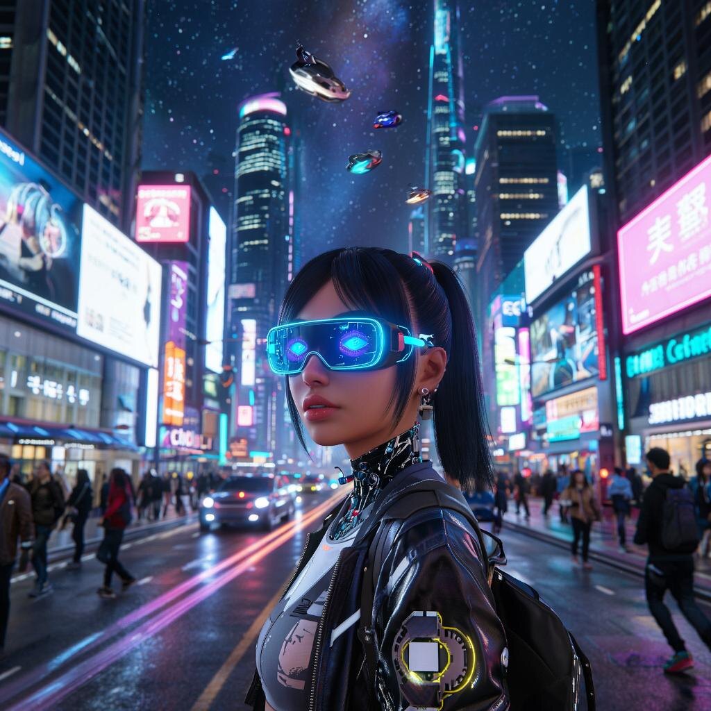 В самом сердце мегаполиса будущего, озарённого неоновыми вывесками и пронизанного сетью виртуальной реальности, жила девушка по имени Лира. Она была уникальной: её тело обладало биологической оболочкой новейшего поколения, мерцающей синим и зелёным свечением, а глаза служили экранами для получения любой доступной информации.