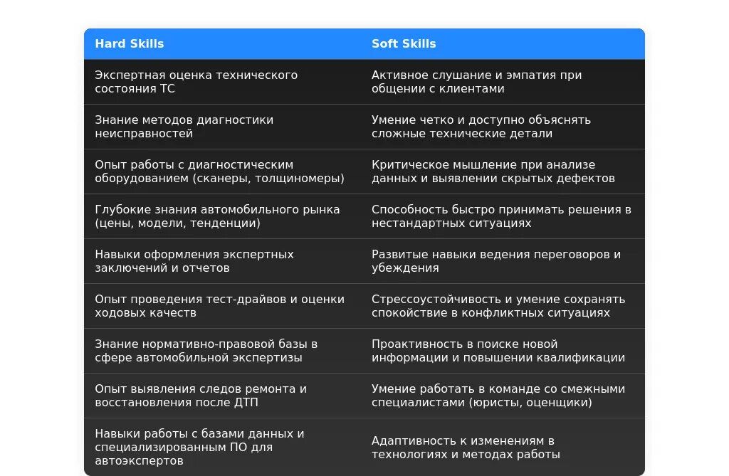- На какие качества и навыки делать акцент: Внимательность к деталям, аналитические способности, знание технической части автомобилей, коммуникабельность, обучаемость.