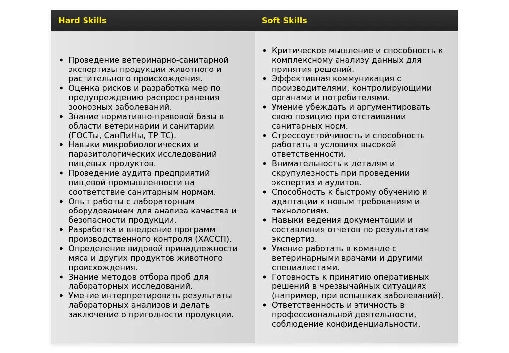 "Навыки: ветеринария, санитария, экспертиза, контроль качества."