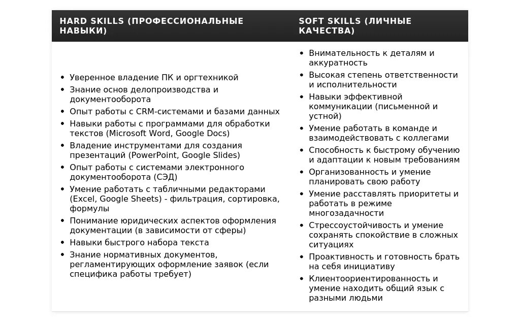 "Навыки: *Работа с документами (оформление, проверка, архивирование)*, *MS Office (Word, Excel – продвинутый уровень)*, *CRM-системы (знание основных функций)*, Коммуникабельность, *Внимательность к деталям*."