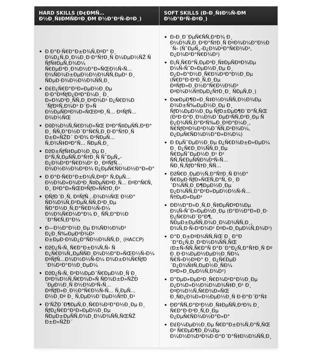 "До:"Навыки: коммуникабельность, ответственность, пунктуальность."После:"Навыки:Управление кухнями в сфере быстрого обслуживания