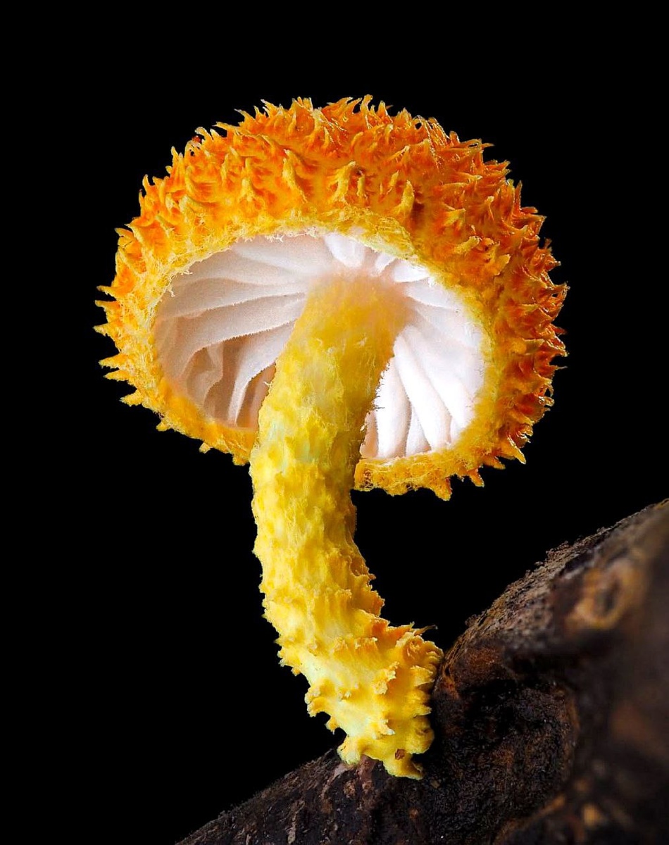 🍄 Прекрасная Коллибия золотисто-рыжая (Cyptotrama asprata). 😌 На первой фотографии показано, как выглядит гриб при обычном белом освещении, вторая фотография сделана с использованием УФ-лампы с длиной волны 365 нм, благодаря чему пластинки флуоресцируют глубоким сине-фиолетовым цветом.