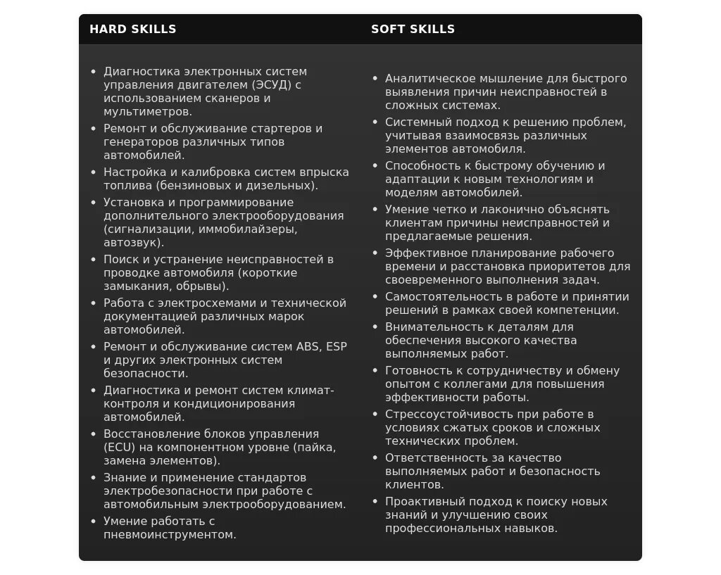 - Ошибка 1: Общие фразы. Вместо конкретных навыков и опыта используются расплывчатые формулировки.❌Пример: Коммуникабельный, ответственный, быстро обучаюсь.✅Пример: Обладаю опытом диагностики и ремонта электрооборудования автомобилей различных марок, включая иномарки. Умею работать с диагностическим оборудованием, читать электрические схемы. Готов к обучению и освоению новых технологий.