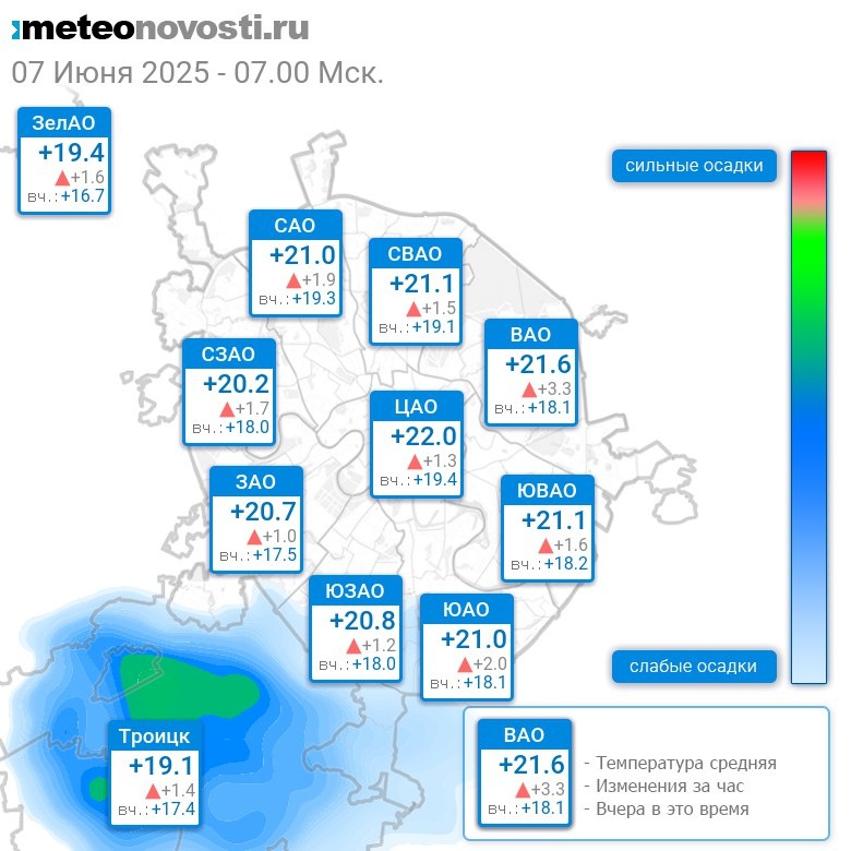 В 7:00 в Москве было от +19.2°C до +22.4°C, средняя температура +20.9°C #погода #Москва #лето #температура #7июня #суббота