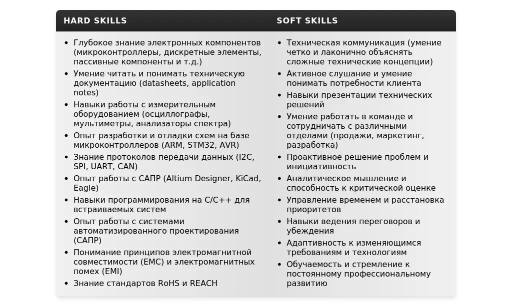 Анализ: Основной акцент делается на знании различных электронных компонентов, умении работать с технической документацией и измерительным оборудованием. В резюме следует упомянуть опыт работы с разными типами компонентов и навыки чтения технической документации.