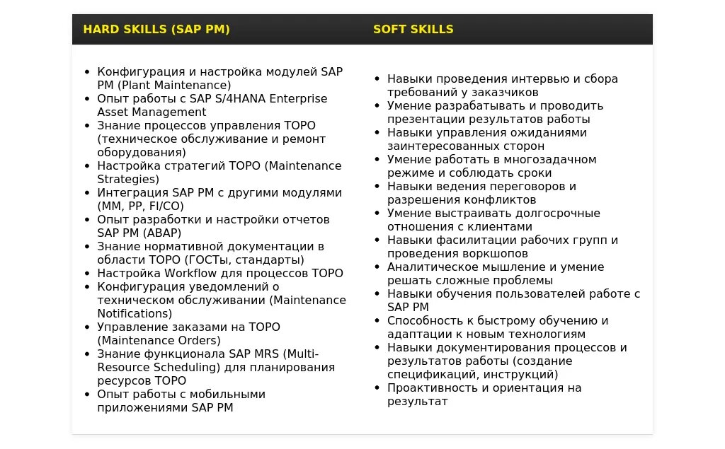 Специалистам с опытом необходимо подчеркнуть свои достижения, профессиональный рост и специализацию в области SAP PM.