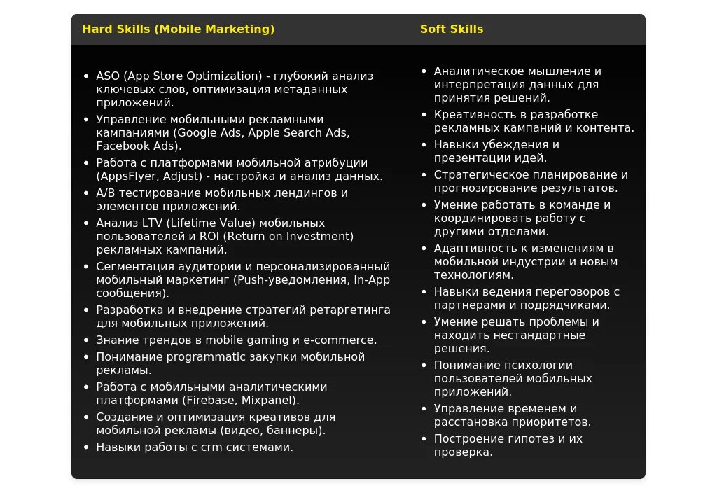 - На какие качества и навыки делать акцент: Аналитические способности, знание основ mobile marketing, умение работать с данными, креативность, коммуникабельность, проактивность.