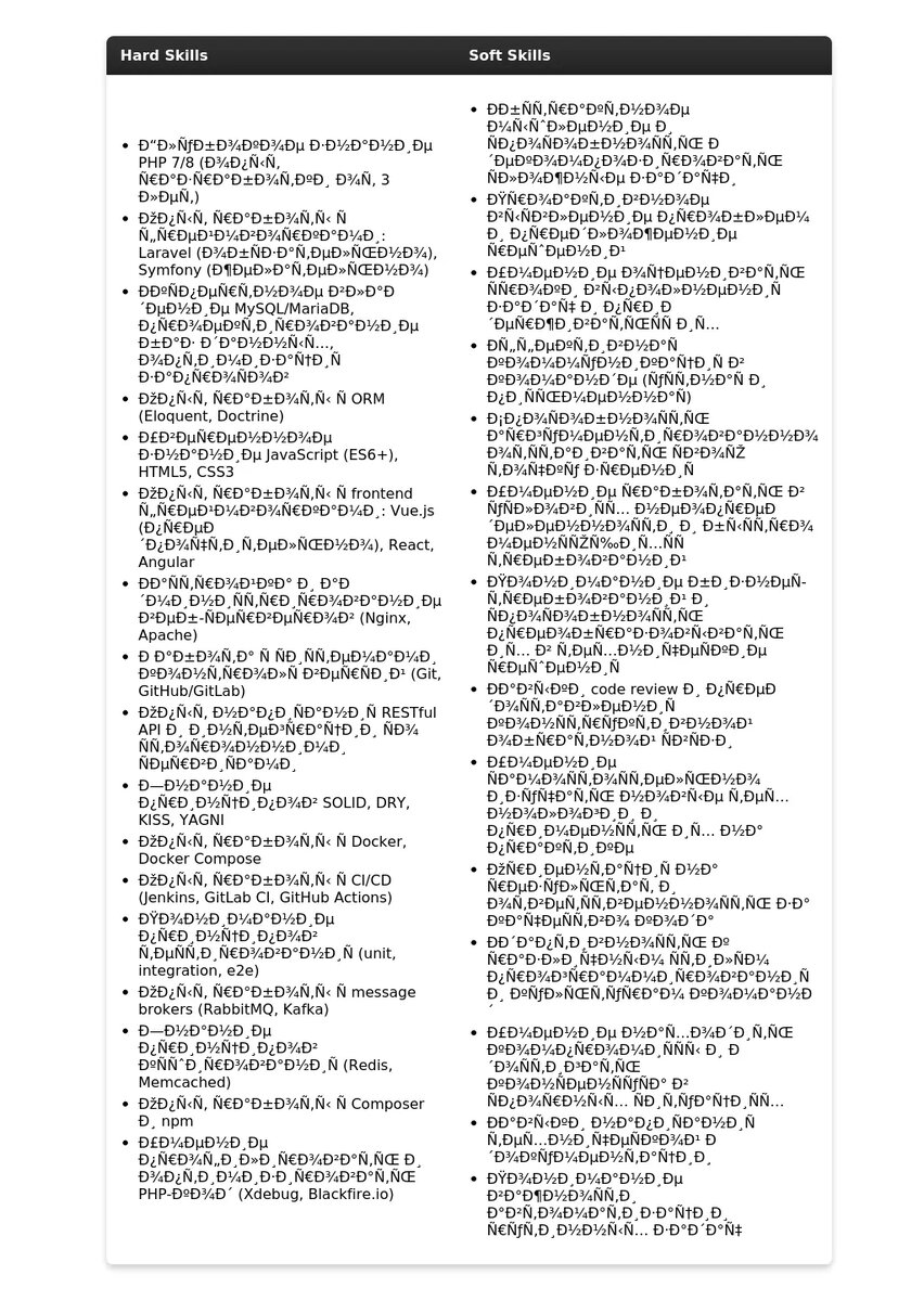 - Перечисление технологий без контекста:"PHP, MySQL, JavaScript, HTML, CSS".Не просто перечисляйте технологии, а укажите, как вы их использовали в своих проектах и каких результатов достигли.