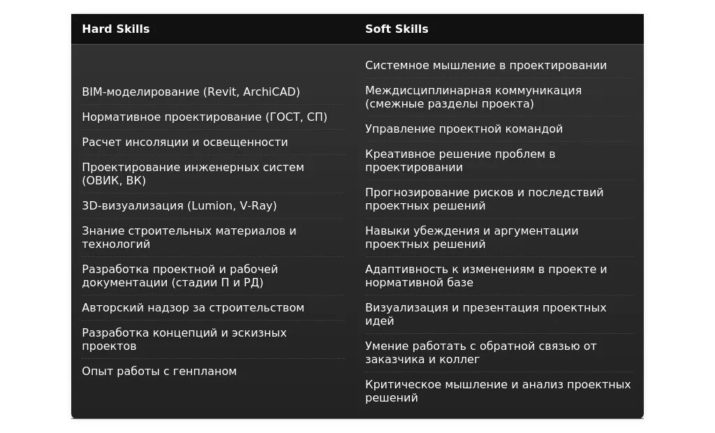 - Определите ключевые компетенции: Определите ключевые компетенции, которые требуются для успешного выполнения работы (например, "знание Revit", "опыт проектирования жилых комплексов", "умение работать в команде").