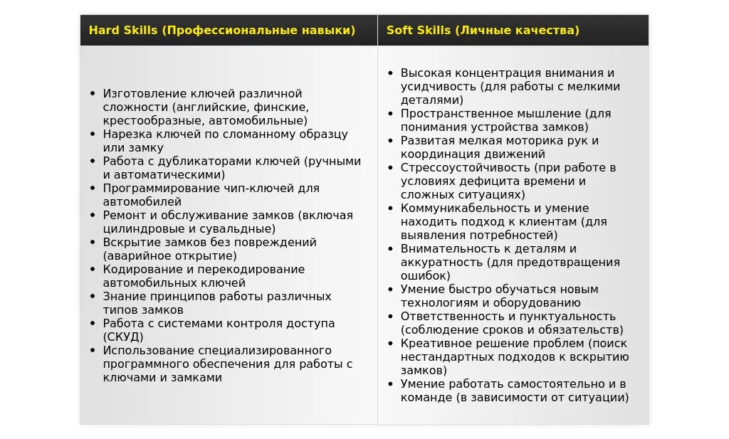 "Пунктуальность, ответственность, умение работать в команде, изготовление ключей."