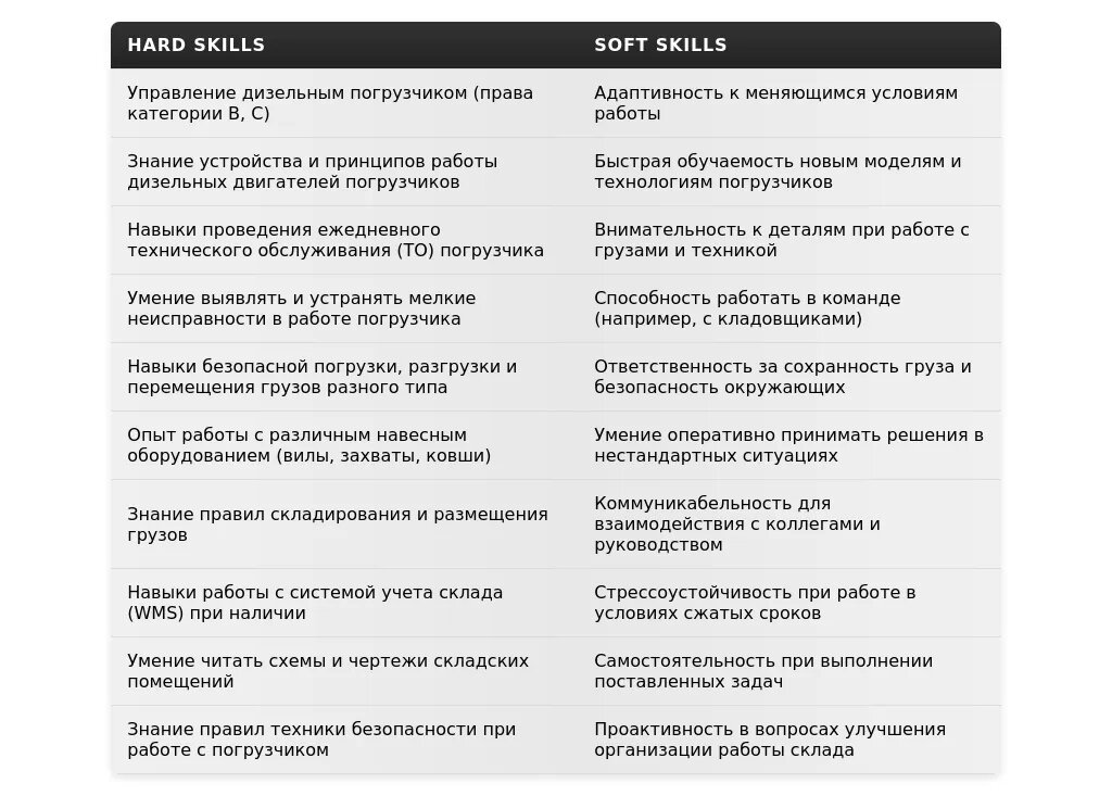 Опыт работы на дизельных погрузчиках (от 3 лет), знание складской логистики, умение работать с системой учета грузов (1С), опыт работы с различными типами грузов.