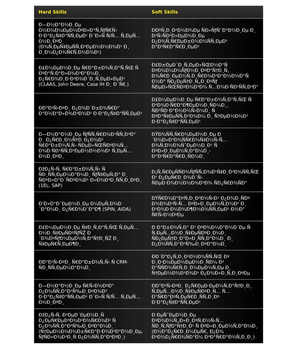 Технические навыки: Знание устройства сельскохозяйственной техники, работа с технической документацией, подбор запчастей по каталогам.