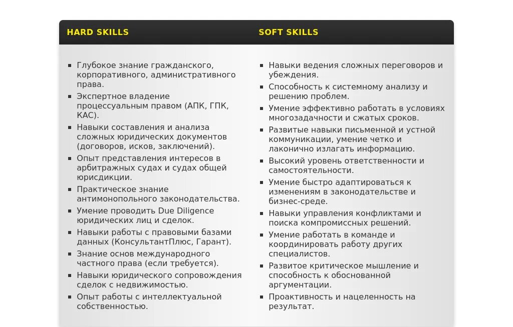 - Группировка по категориям: Сгруппируйте навыки по категориям (например, знание законодательства, навыки составления документов, навыки представления интересов в суде).