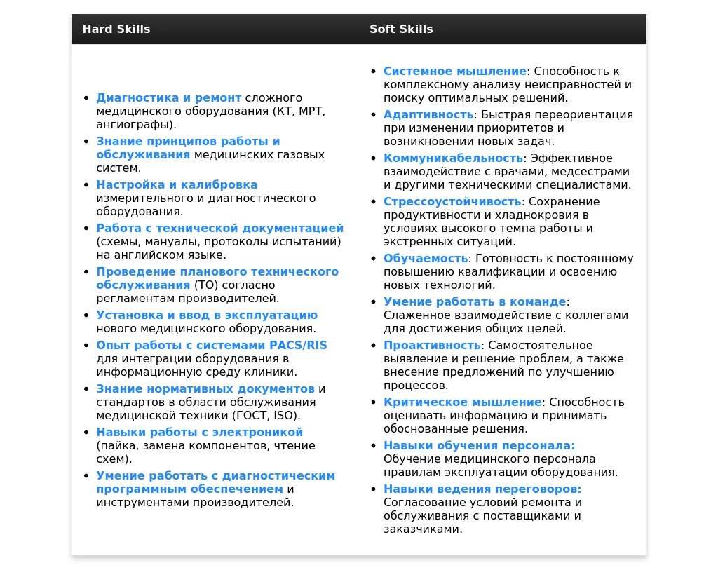"Навыки: Обслуживание медицинского оборудования, ремонт, диагностика, техническое обслуживание."