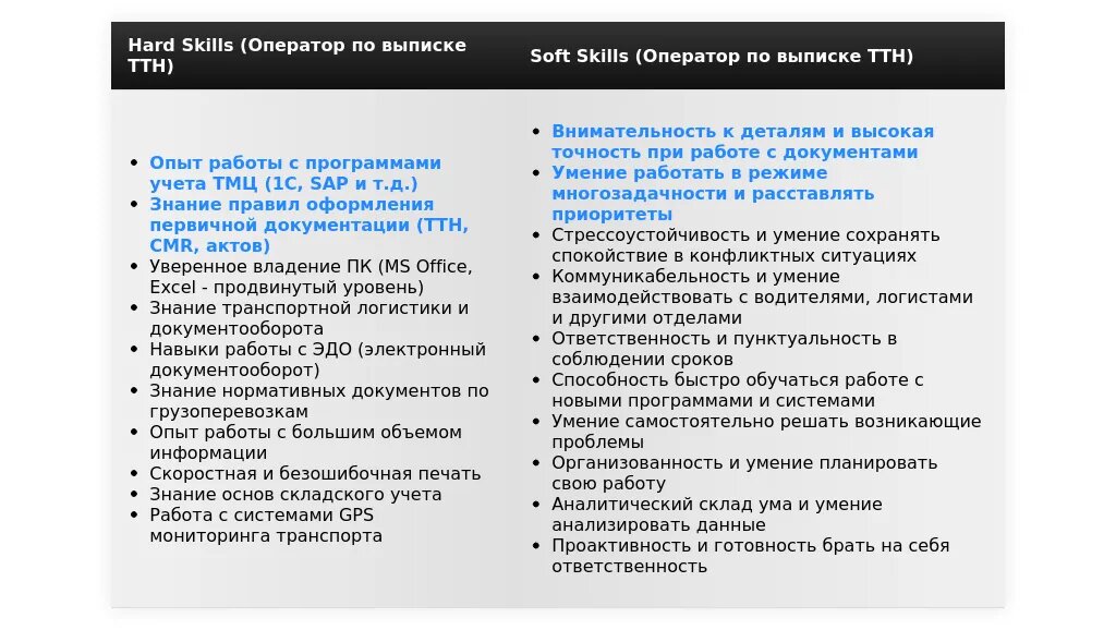 Ключевые навыки, релевантные для позиции оператора по выписке ТТН (например, знание 1С, внимательность, скорость печати).