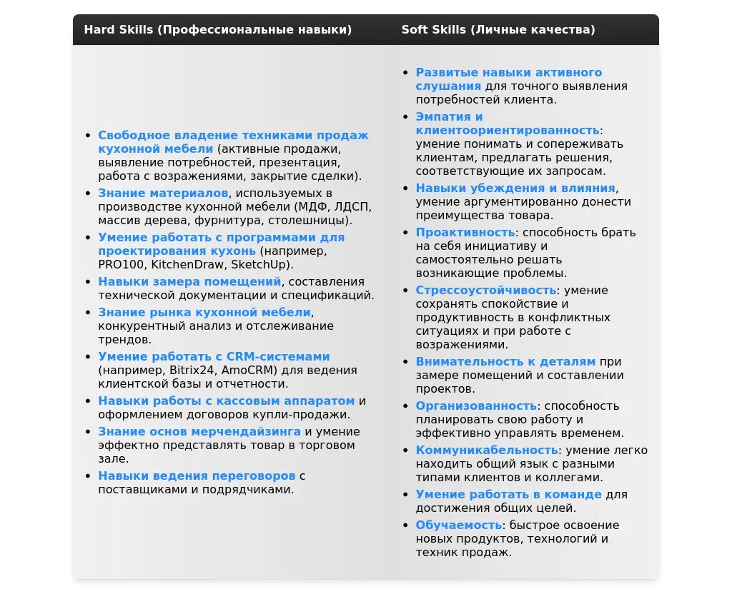 - На какие качества и навыки делать акцент: Коммуникабельность, умение убеждать, знание материалов и фурнитуры для кухонной мебели (если есть), навыки работы с компьютером и CRM-системами, клиентоориентированность.