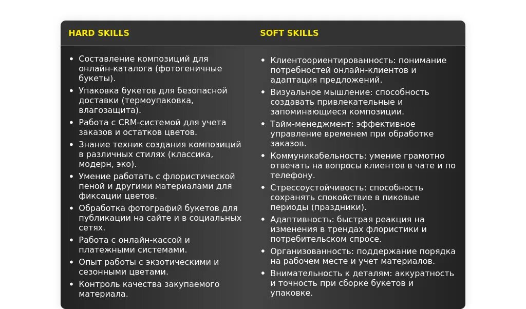 Обязательные требования – это то, без чего вас просто не рассмотрят. Например, опыт работы флористом, знание техник составления букетов, умение работать с кассой.