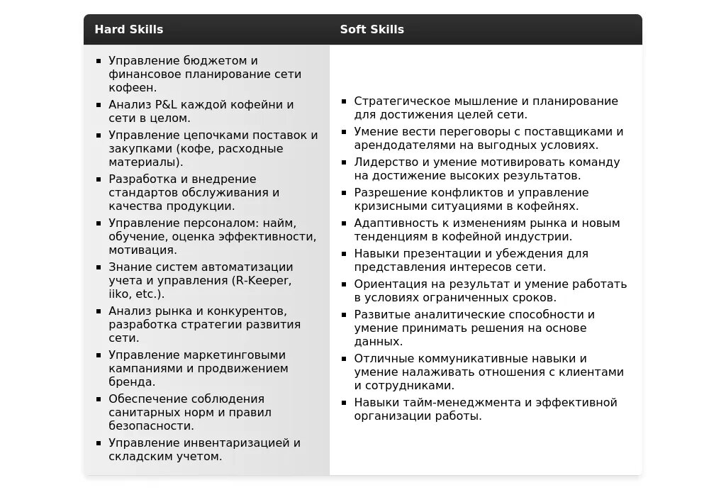 - Обязательная информация:Ключевые навыки и компетенции, релевантные должности управляющего сетью кофеен.