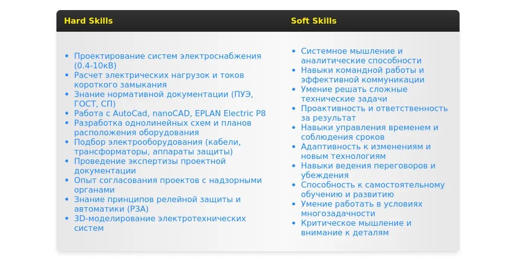 - Промышленное предприятие: "Проектирование систем электроснабжения промышленных объектов", "знание ПУЭ", "опыт работы с промышленным оборудованием", "обеспечение бесперебойного электроснабжения".