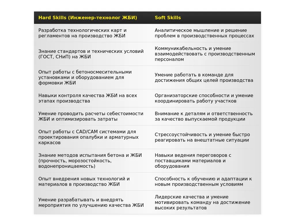 - Технологические навыки: Знание технологии производства сборного железобетона, опыт работы с опалубочными системами, контроль качества ЖБИ.