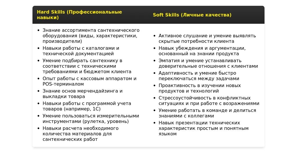Ваши ключевые навыки, релевантные для позиции (например, знание сантехнического оборудования, навыки продаж, умение работать с клиентами).