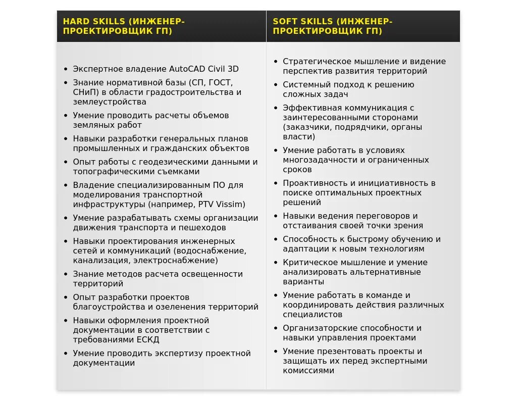 - На какие качества и навыки делать акцент: Знание программного обеспечения (AutoCAD, Civil 3D), понимание нормативной документации, умение работать в команде, аналитические способности.