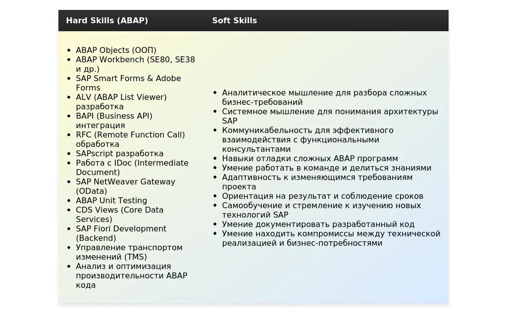 - ABAP разработчик: "Разрабатывал ABAP-кода", "Отлаживал и тестировал ABAP-код", "Создавал отчеты и интерфейсы", "Участвовал в проектах по внедрению SAP".