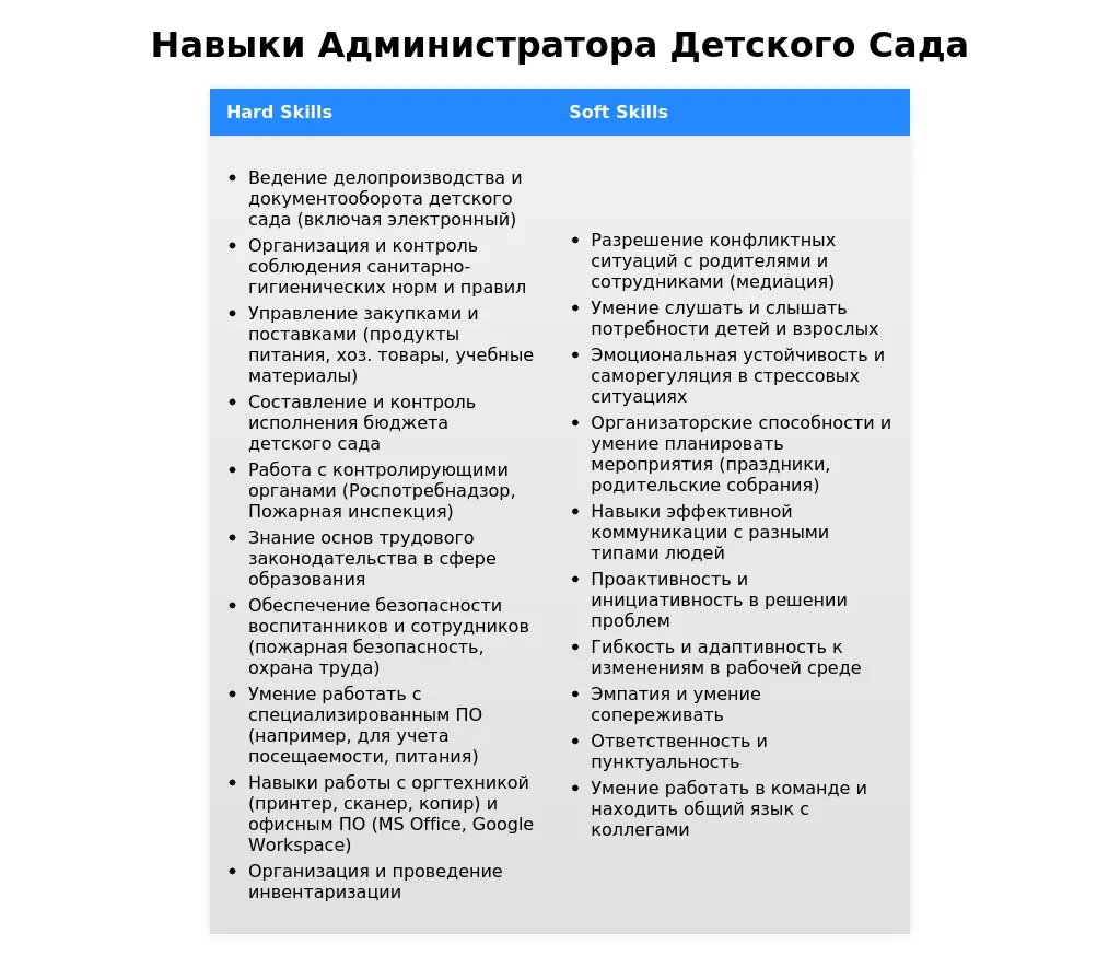 - Для вакансий в муниципальных детских садах: "Знание СанПиН", "Опыт работы с бюджетной документацией", "Взаимодействие с государственными органами".